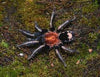 This stunning dwarf tarantula features a rich dark body with a contrasting golden to orange heart-shaped patch on the abdomen.