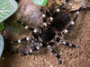 This large species of tarantula reaches about 6.5" across and displays an amazing high contrast color of black accented with white bands and a red abdomen.