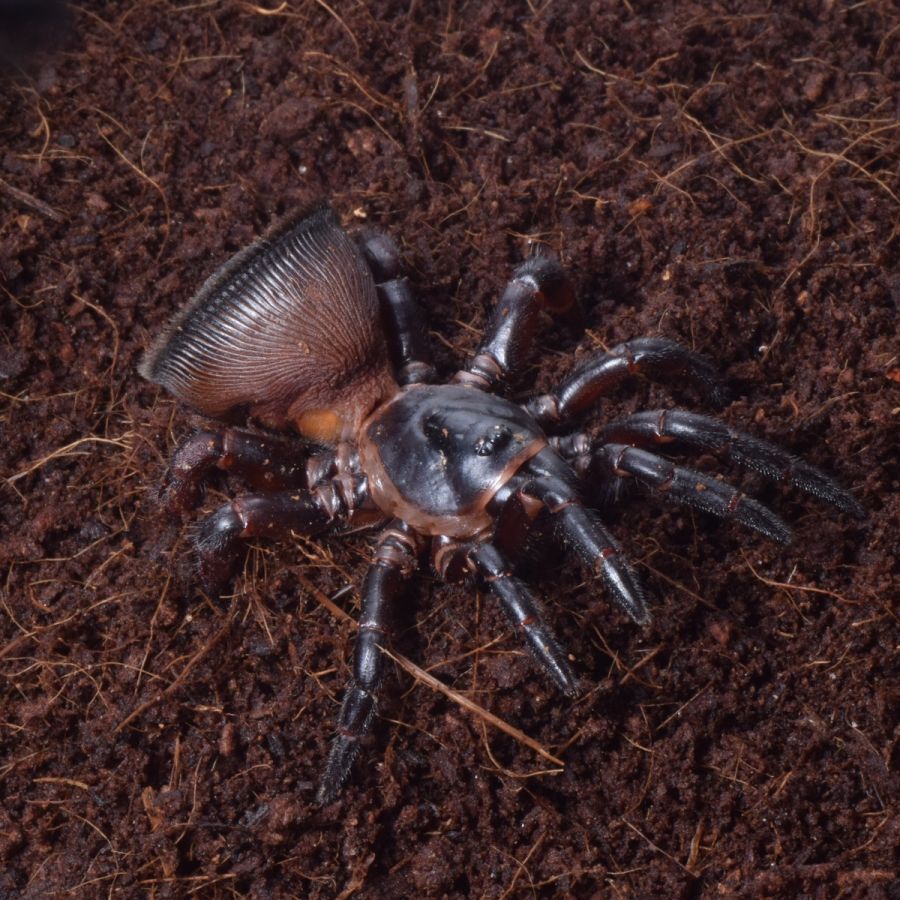 One of the most bizarre spiders in the hobby, this species features a heavily armored, circular abdomen that functions like a trapdoor plug.