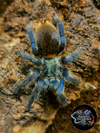 This species only gets about 3" leg span and features a bright shiny electric blue body and legs, with orange hairs across the abdomen and greenish carapace. They have an awesome feeding response, grow quickly and web a lot!