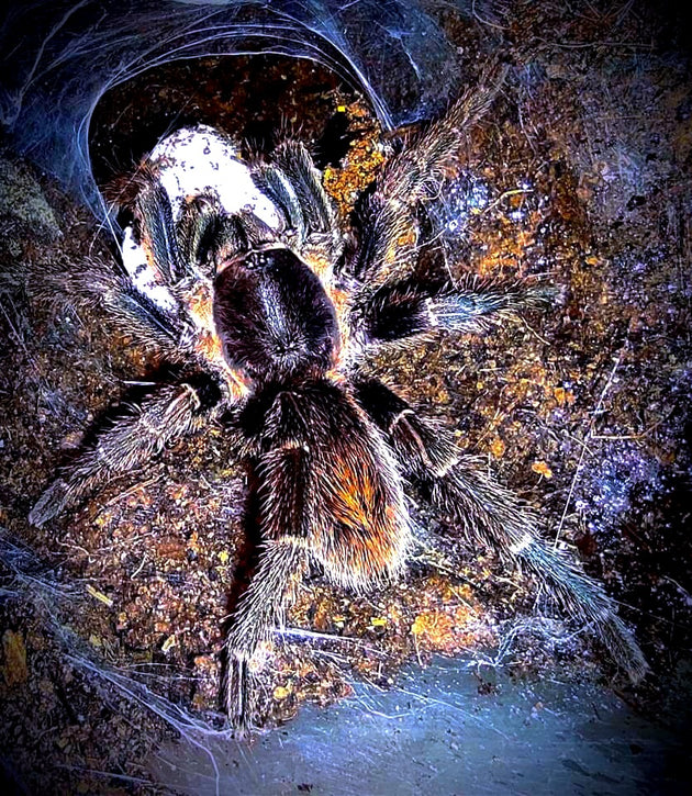 We measure tarantulas and spiders in diagonal legspan. This means the distance from the front right to back left leg (or vise versa) when the animal is stretched out.
