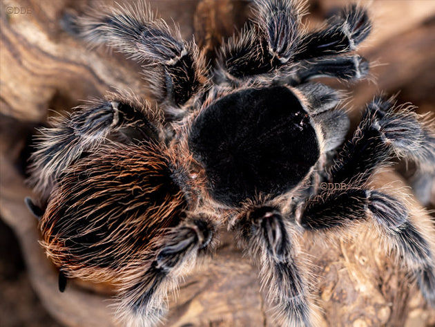 This stunning species is often mistaken for its cousin, Lasiadora parahybana (Salmon Pink Birdeater), but it features a darker black body with a vibrant reddish abdomen, setting it apart in any collection.
