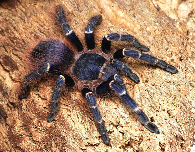 This is a gorgeous new species from South America that has a beautiful blue coloration all over with white bands on the joints of the legs, red hairs all over the body and a blue carapace.