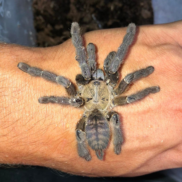 We measure tarantulas and spiders in diagonal legspan. This means the distance from the front right to back left leg (or vise versa) when the animal is stretched out.