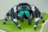 This species is black with white markings and gets about 1-1.5". The males have green chilcerae (fangs) and the females have lavender ones!