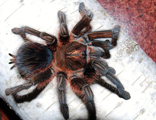 A bold and fast-growing species from the Caribbean, this large terrestrial tarantula displays a velvety dark body with striking reddish setae on the abdomen and legs.