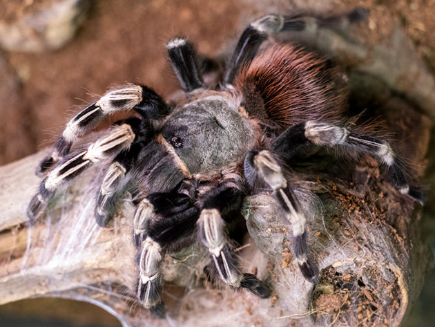 This stunning species features a light carapce, black legs with white bands and a red abdomen.Â