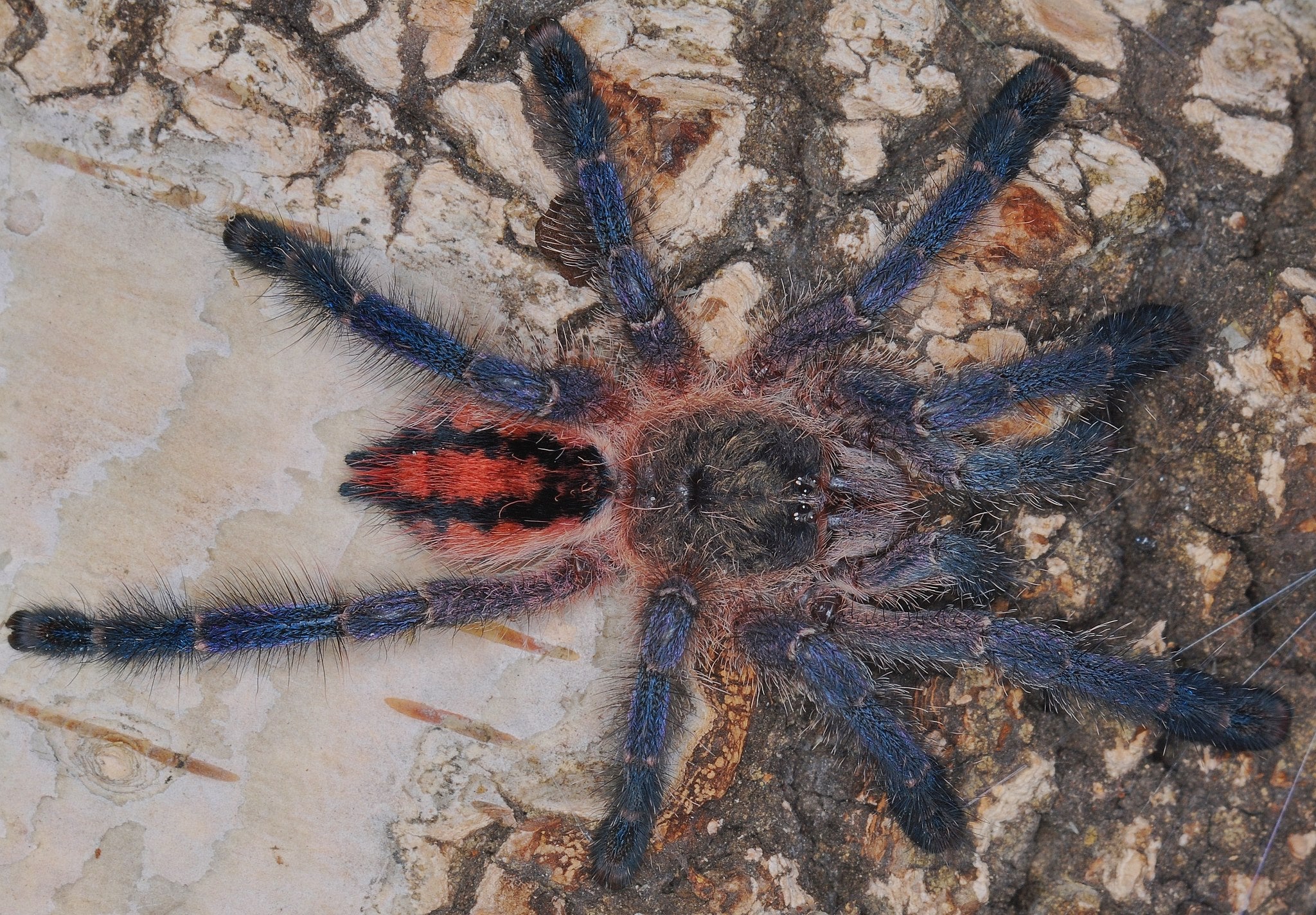 Similar to others in the genus, the juvenile coloration is also stunning as they transition to adult colors they gain blue legs, with a pink, red and black abdomen (first photo) keeping some of those red "fangs".Â